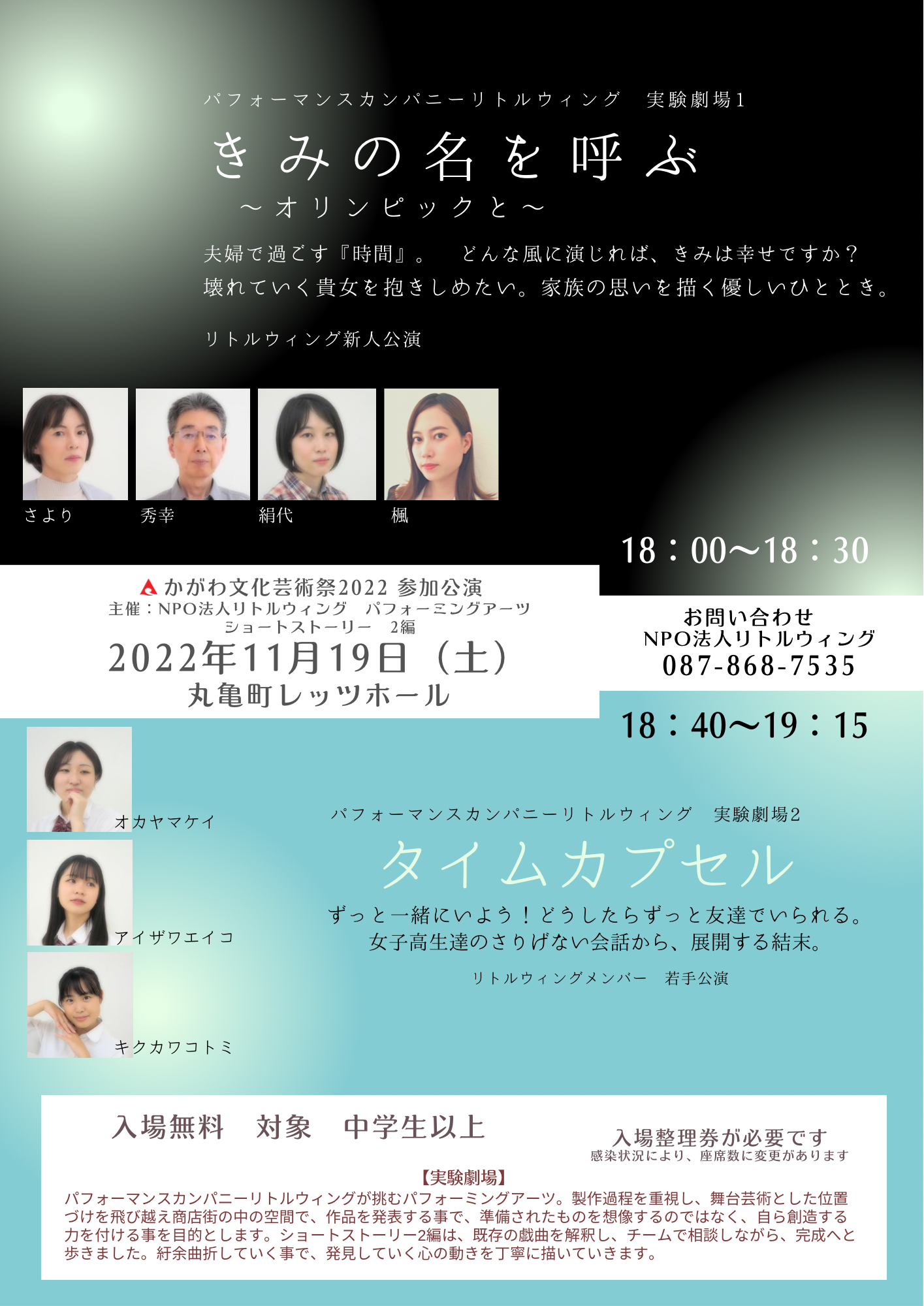 『シャレコウベの子守唄』~あらすじ~それは78年前の物語。広島に住む中学生4人の女の子たちは、戦争の中でも明るく前向きに過ごしていました。戦況が悪化している中、学校に向かう最中、幻想的な空間に迷い混むのでした。現実か幻か彷徨う人々の声に耳を傾け、現実を受け止めていきます。ぜひ、会場にお越しください。